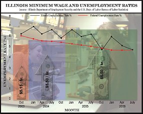 ![]() Critics pan proposal to raise minimum wage to nation's second highest By ALAN J. ORTBALS![]() While the federal minimum wage of $5.15 per hour hasn't increased in nine years, the state of Illinois has enacted its own increases going to $5.50 per hour in January 2004 and up to $6.50 per hour in January 2005. In his campaign for re-election, Gov. Rod Blagojevich has called for an additional increase to $7.50 per hour, which would make Illinois' rate second only to the state of Washington. According to Andrew Ross, spokesman for Blagojevich, raising the minimum wage is part of raising the overall economic well being of the state. "I think the numbers really tell the story," Ross said. "Since January 2004, Illinois has gained more than 150,000 new jobs, which is more than any other Midwest state. The total number of jobs created this year alone is more than 75,000 new jobs, which is [continue] | ||||||||||